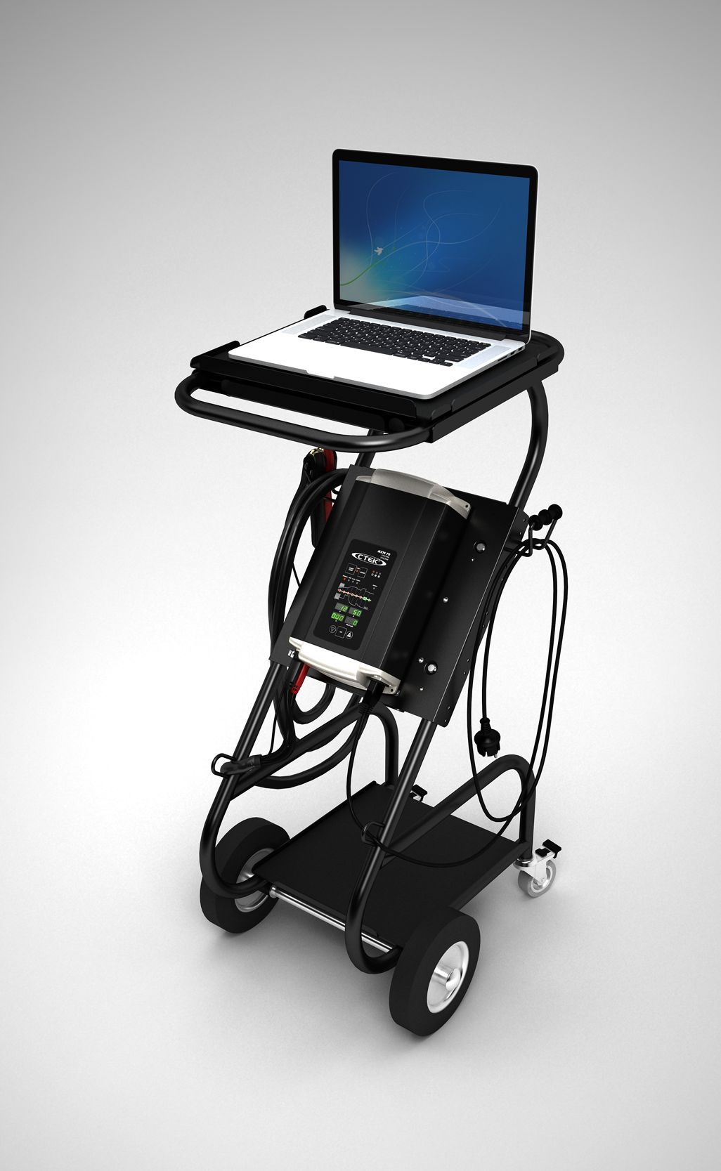 Bær med deg alt batteristyringsutstyr som CTEK-lader, bærbar datamaskin, batterier og andre analyseinstrumenter sammen med denne komplette teststasjonen. De to store hjulene gjør den svært flyttbar og mulig å manøvrere på trange steder. Leveres med kroker for praktisk kabeloppevaring.