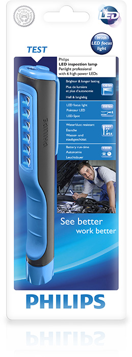 Philips LED pennlampa har 6 dioder som huvudljus samt 1 diod i toppen för pekare. Pennlampan drivs av 3 st AAA batterier och har en brinntid på ca 11 timmar, ger 130 lumen och 250 lux på 0,5m avstånd. Tål fall från 1,5 meter, lösningsmedel och kemikalier samt damm och vatten (IP54).