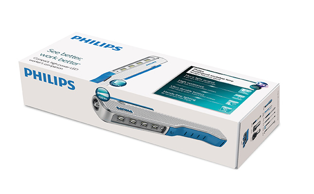 Philips LED pennlampa har 4 dioder som huvudljus samt 1 diod i toppen för pekare. Pennlampan drivs av ett laddbart batteri och har en brinntid på ca 6 timmar, ger 145 lumen. Tål fall från 1,5 meter, lösningsmedel och kemikalier samt damm och vatten (IP54).