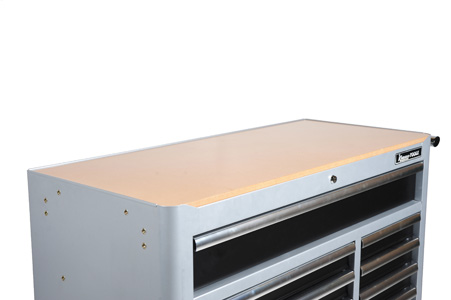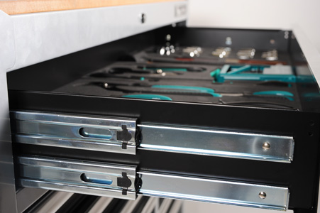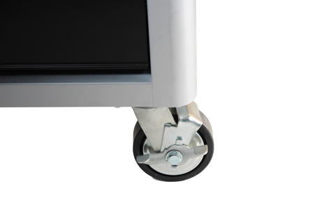 Verktygsvagn i stabil dubbelväggs konstruktion av stål. (RAL9006) Lådorna är fullt utdragbara med kraftiga, 46mm, kullagrade skenor. Den stora topp lådan är utrustad med dubbla skenor. För
