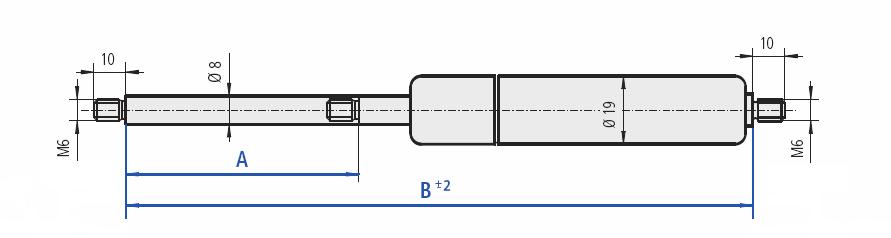 Gasfjäder med gänga M6, kolvstång 8 mm.
